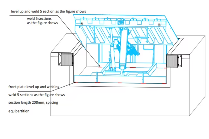 Completing the frame, weld it to the pit steel and insert all anchors. Do not use the leveler until the welds are cooled.
